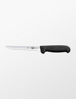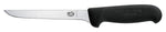 Victorinox Fibrox boning knife with 12 cm long blade and black plastic handle.