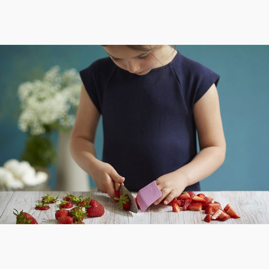 This plastic shield allows to protect the hand which holds the food to be cut : the first two folded up phalanxes, the thumb and the little finger hold the food. The style of the Chefs!
