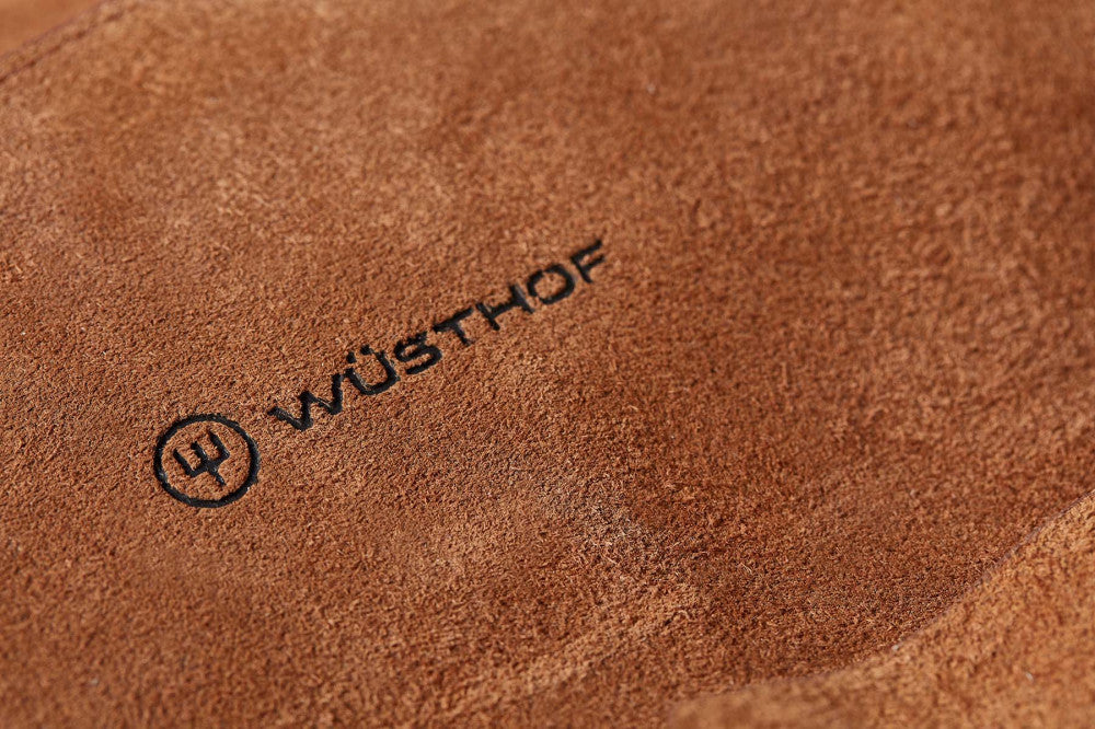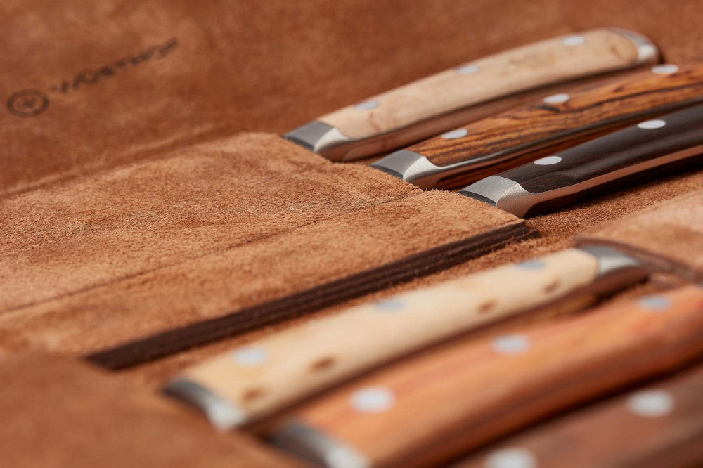 The limited edition Wüsthof Ikon mixed wood steak set combines design and precision in the form of a decorative work of art. This set includes six iconic steak knives - each with a distinctive wooden handle from different parts of the world. Each knife has a uniquely grained handle made of African blackwood, American walnut, Latin American bocote, Canadian bird's eye maple, Scandinavian curly birch and Brazilian tulipwood. The handmade leather case made of natural Tuscan cowhide provides a sophisticated and simple storage solution for the unique set. Available in limited quantities. Entirely made in Solingen, Germany.