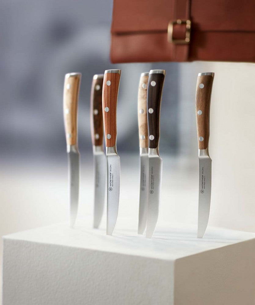 Wüsthof Ikon Steak Knife Set, 6-piece, with wooden handle, in leather case.